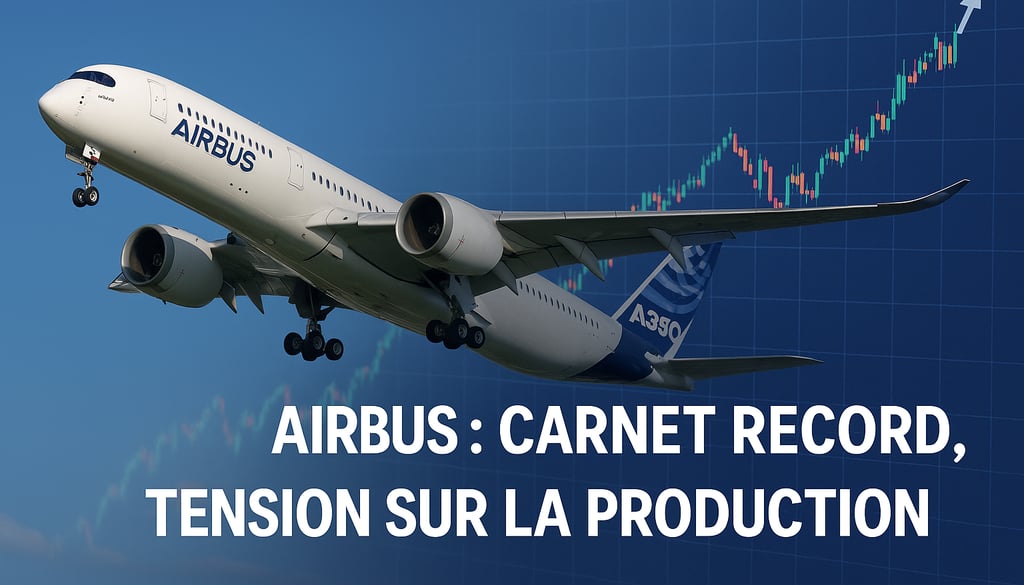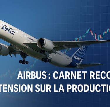 Airbus : carnet record, production sous tension. 8 700 avions en commande. Objectif : 75 livraisons/mois d’ici 2026. Cours : 203 €. Une machine bien huilée… à surveiller de près.
