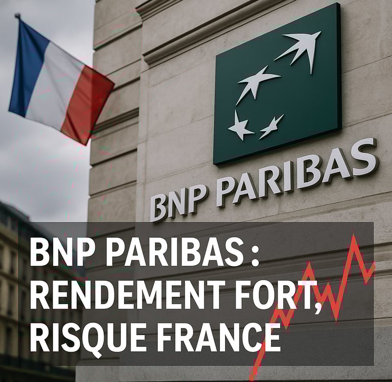 BNP Paribas : rendement élevé, mais vigilance sur le risque France. Dividende >6 %, PER ~6,5. Ratio CET1 solide (13,5 %). Exposition souveraine à surveiller