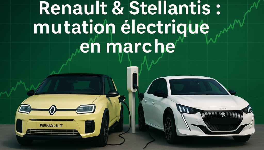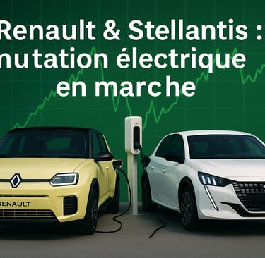 Renault & Stellantis : mutation électrique. Renault à 35,78 € : scission Ampere/Horse. Stellantis à 9,01 € : rendement 8 %, rentabilité record. Deux approches, un même défi : l’Europe électrique. Des valeurs décotées, mais stratégiques pour l’avenir.
