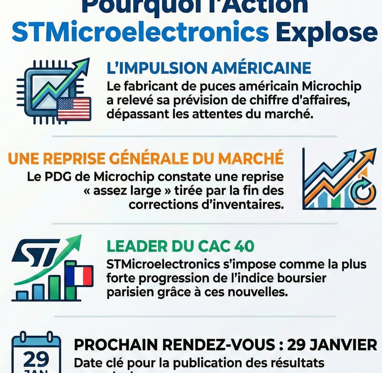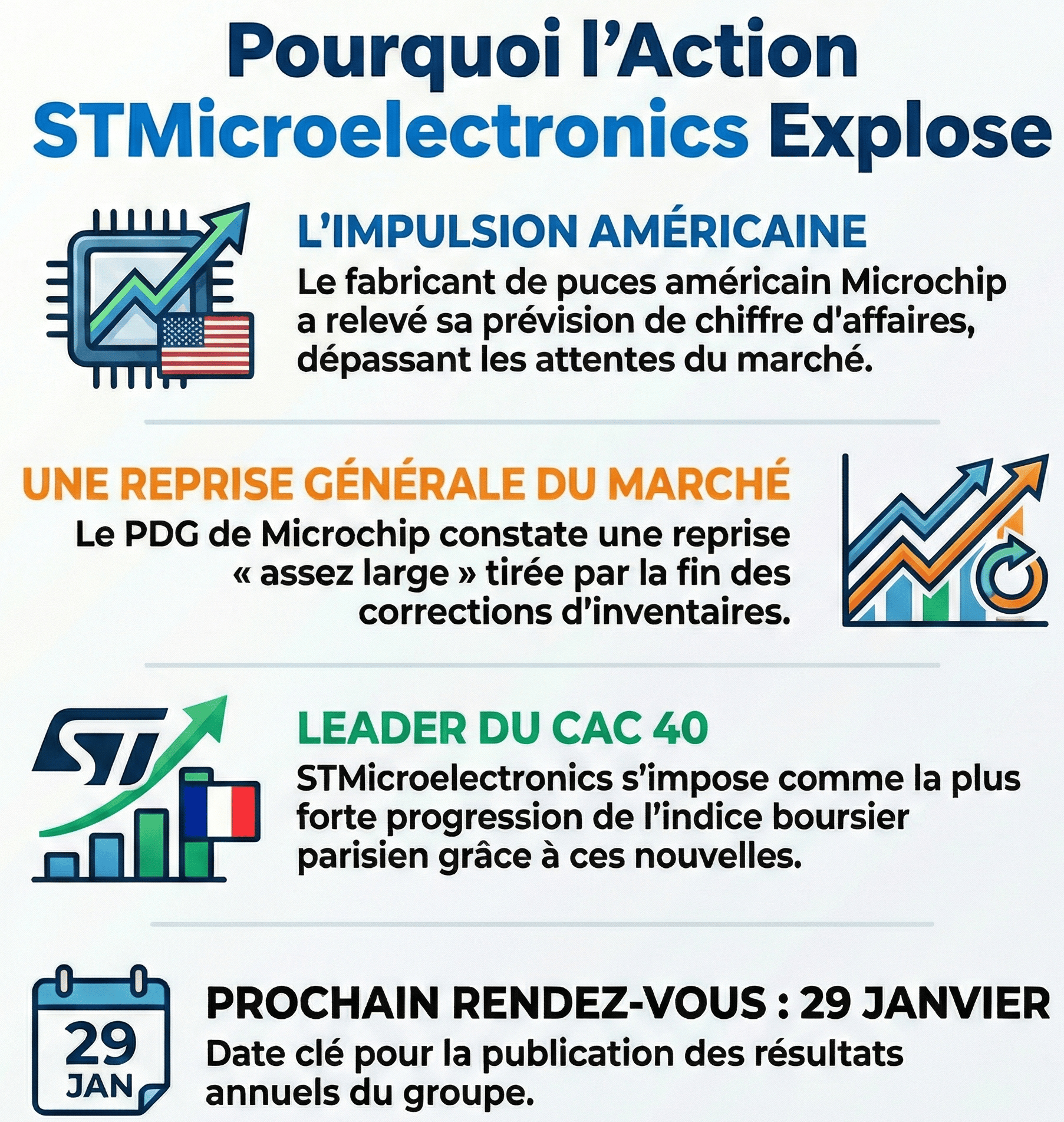 Cette flambée des cours ne trouve sa source ni à Paris ni à Milan, mais dans une annonce faite la veille au soir à Chandler, en Arizona, par le concurrent américain Microchip Technology. Le fabricant de puces a relevé sa prévision de chiffre d'affaires pour le trimestre clos au 31 décembre dernier à 1,185 milliard de dollars. Ce relèvement, bien supérieur à son objectif précédent (entre 1,109 et 1,149 milliard) et aux attentes du marché (1,14 milliard), a eu un effet d'entraînement immédiat, démontrant la forte interconnexion du secteur où la bonne fortune d'un acteur majeur est perçue comme un baromètre pour tous les autres.